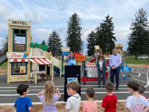 A new playground at the Williamson Road Library Branch cut a ribbon today – the Plaza de Esperanza – “Hope Square,” was designed by a Danish company and is designed with features that evokes Williamson Road businesses. Some of the signage at the Plaza de Esperanza is in Spanish, a nod to the large number of Hispanic residents in the area. Part of a $2.9 million dollar federal “Safer Communities,” grant passed through the state has paid for the new playground at the Williamson Road public library. Amber Lowery is the Roanoke Public Libraries director: